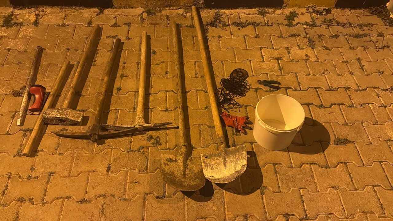 Kaçak kazı yapan 5 şüpheliyi suçüstü yakalayan ekipler, kazıda kullanılan 2 spiral, 2 kazma, 2 kürek, balyoz, kova, tahta çubuk, 1 metre kablo ve levye ele geçirdi.