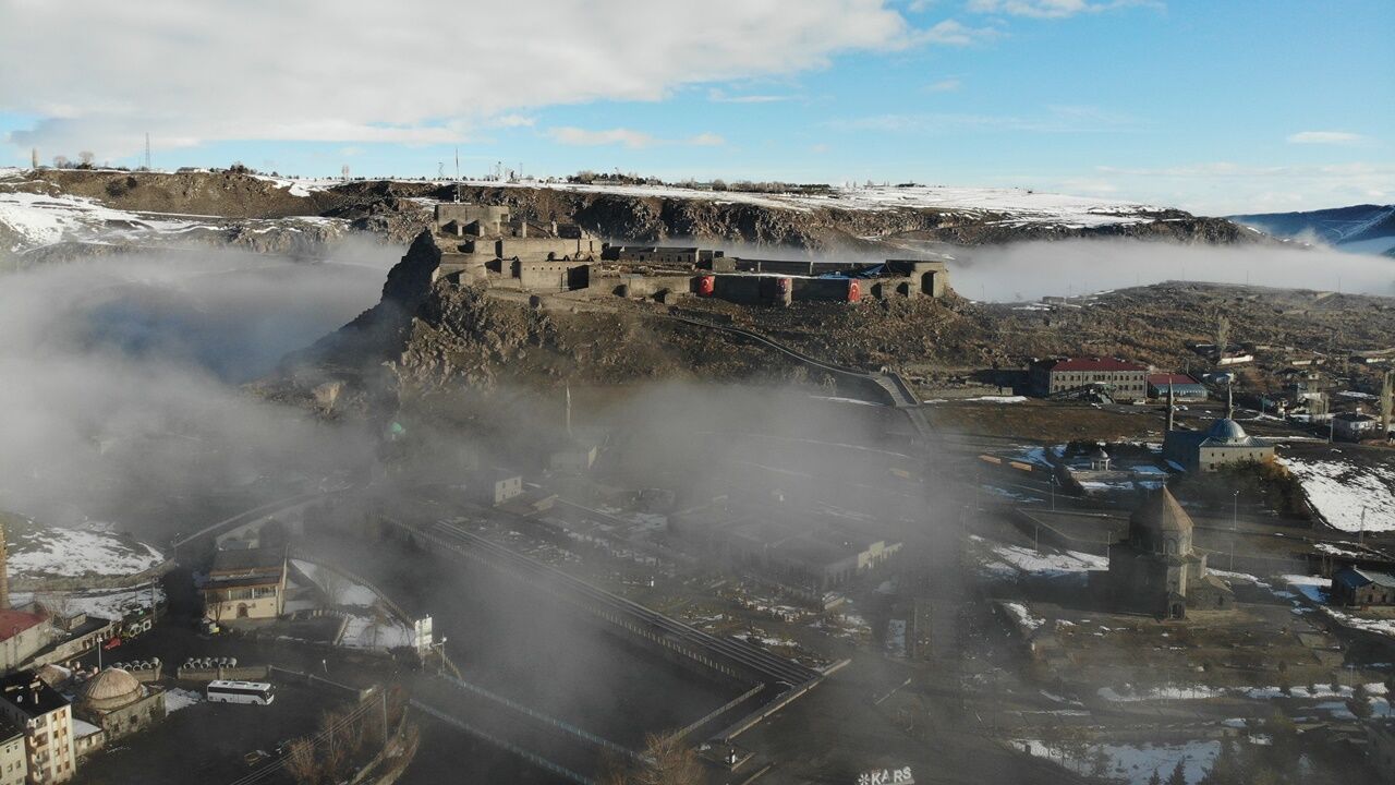 Kent merkezine hakim konumda bulunan Kars Kalesi, sis bulutlarının arasında zaman zaman görünmez hale geldi. Aynı karede yer alan tarihi kilise ve Evliya cami ise sisin arasından siluet şeklinde belirdi. Ortaya çıkan görüntüler, kentin tarihi dokusunu farklı bir atmosferle buluşturdu.