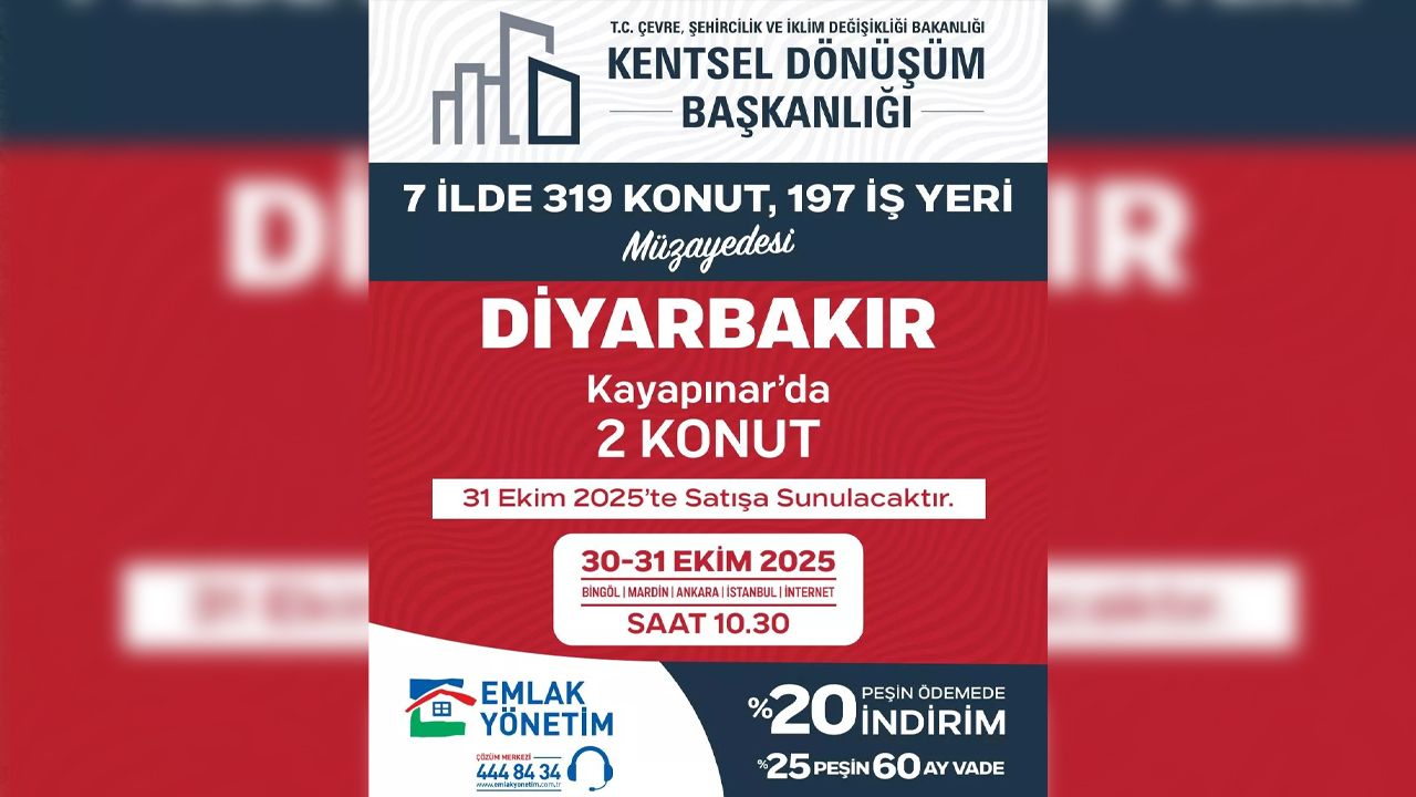 Çevre Şehircilik ve İklim Değişikliği Bakanlığı tarafından verilen resmi ilana göre 7 ilde 319 konut, 197 iş yeri müzayedesi başlıyor. Müzayedeler arasında Kayapınar’da 2 konut 31 Ekim tarihinde İstisna ve Kapsam Dışı İhaleler usulü ile ihaleye çıkacak. Konutlarda yüzde 20 peşin ödemede indirim sağlanırken yüzde 25 peşin ödeme ile 60 ay vadeli olarak satılacak.