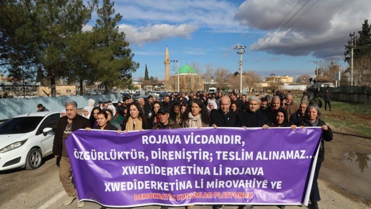 Mardin’in Kızıltepe ilçesine bağlı Kuzey ve Doğu Suriye’nin Dirbesîyê kenti sınırında bulunan kırsal mahallesinde Demokratik Kurumlar Platformu’nun çağrısıyla bir araya gelen yurttaşlar HTŞ’ye bağlı grupların Kuzey ve Doğu Suriye'ye dönük saldırıları protesto edildi.