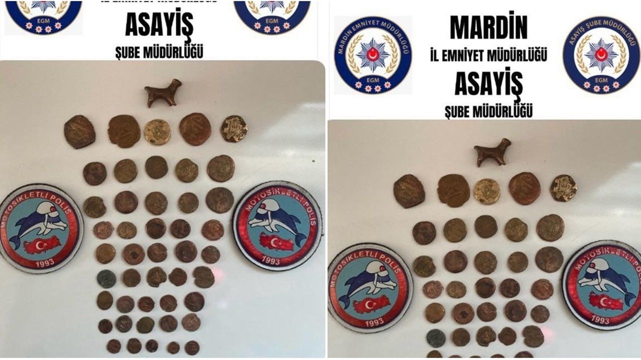 Edinilen bilgilere göre, Artuklu ilçesinde durdurulan bir araçta yapılan kontrollerde, farklı renk, ebat ve kabartmalara sahip 45 adet sikke ile 1 adet hayvan figürlü heykel bulundu. Ele geçirilen eserlerin tarihi eser niteliğinde olduğu değerlendirildi. Olayla bağlantılı 2 şüpheli şahıs yakalanarak gözaltına alınırken, şüpheliler hakkında adli işlem başlatıldı.
