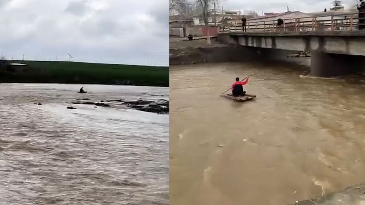 Mardin'de son günlerde etkili olan sağanak yağışlar, bölgede uzun zamandır görülmeyen manzaralara neden oldu. Yaklaşık 40 yıldır kurak olan dere yatakları yeniden suyla dolarken, bazı bölgelerde taşkınlar meydana geldi. Derik ilçesi Kurudere Mahallesi'ndeki Büyükdere de yağışların ardından debisini ciddi şekilde artırdı. Taşan derede dikkat çeken anlar yaşandı. Mahallede yaşayan bir vatandaş, derede kendi imkanlarıyla yaptığı sal ile suyun üzerinde ilerledi. Tehlikeye rağmen sal ile derede gezinti yapan vatandaşın o anları cep telefonu kamerasına yansıdı.