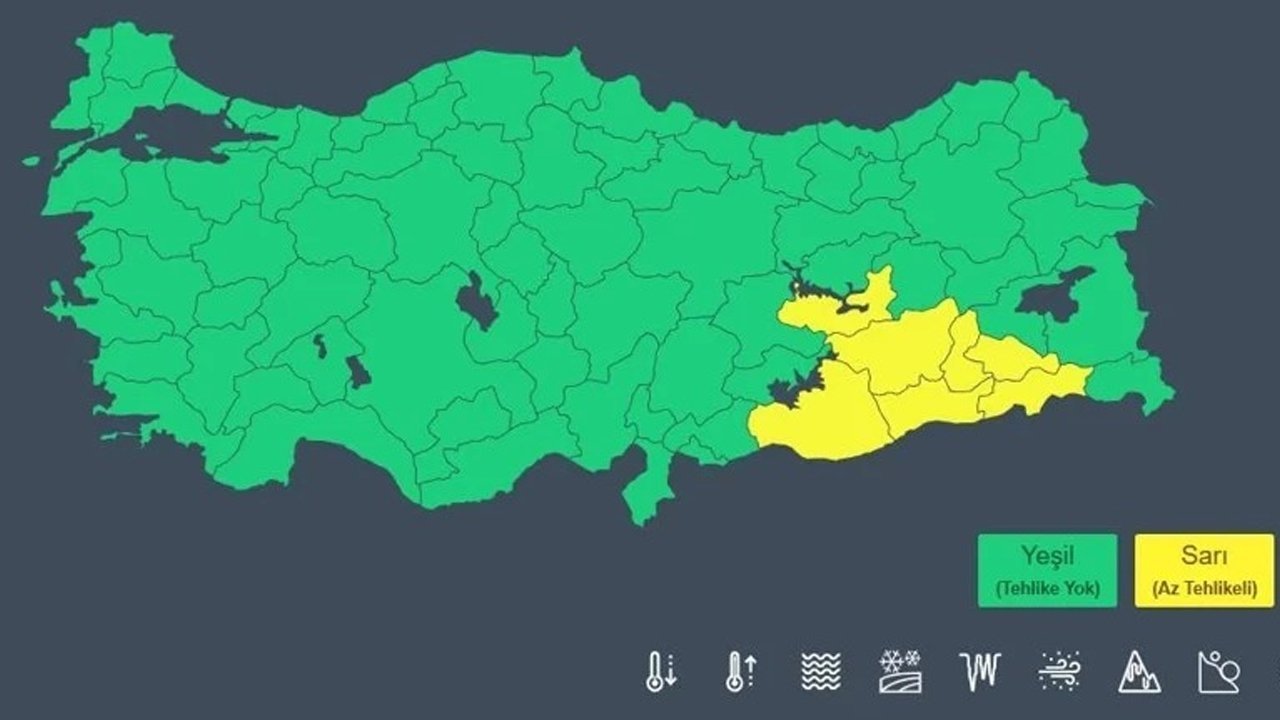 Meteoroloji'nin sarı kodlu uyarı verdiği iller Diyarbakır, Elazığ, Mardin, Siirt, Şanlıurfa, Batman, Şırnak oldu.