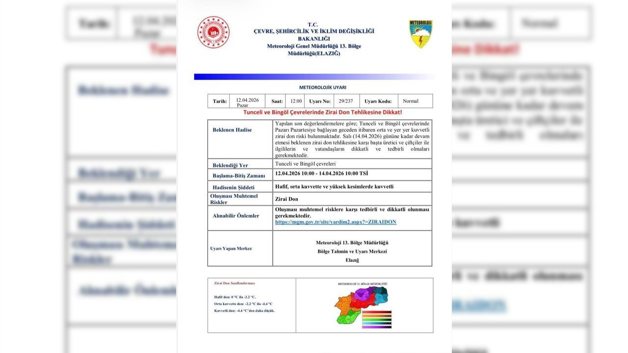 Meteoroloji 13'üncü Bölge Müdürlüğü’nden yapılan açıklamada, “Yapılan son değerlendirmelere göre; Tunceli ve Bingöl çevrelerinde Pazarı Pazartesiye bağlayan geceden itibaren orta ve yer yer kuvvetli zirai don riski bulunmaktadır. Salı (14.04.2026) gününe kadar devam etmesi beklenen zirai don tehlikesine karşı başta üretici ve çiftçiler ile ilgililerin e vatandaşların dikkatli tedbirli olmaları gerekmektedir” ifadelerine yer verildi.