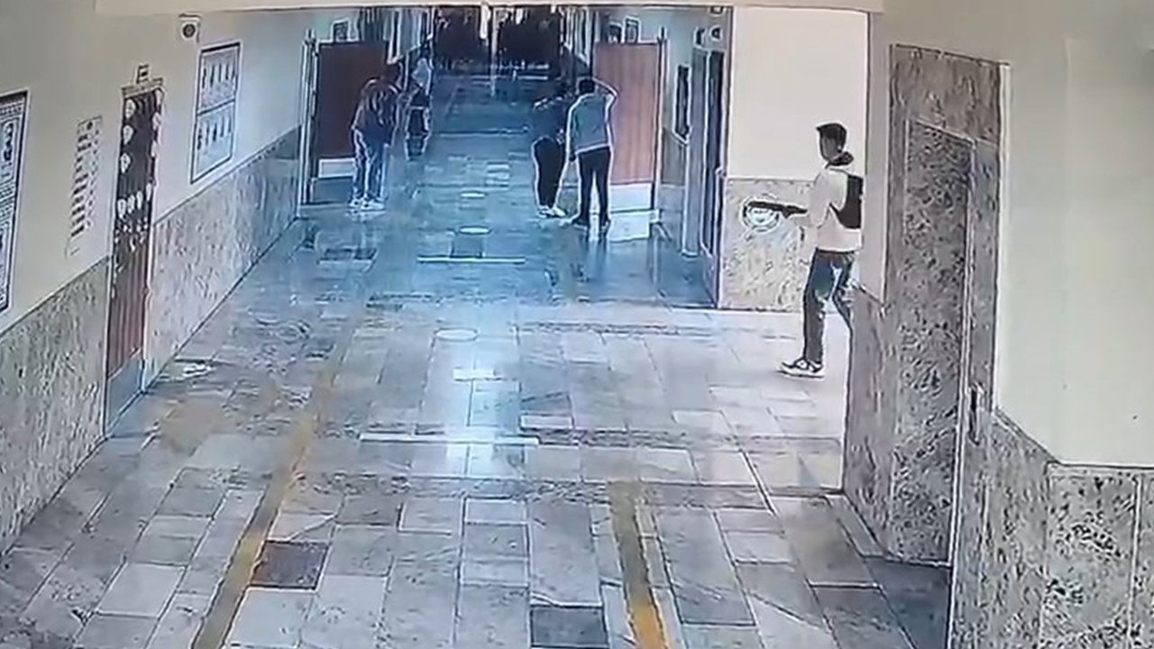 Görüntülerde saldırganın elinde silahla okula girdiği koridorlarda öğrencilerin kaçışı görülüyor.