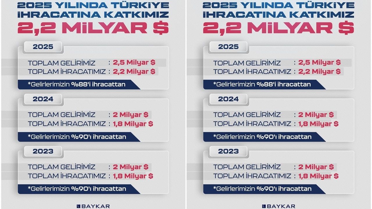 Türkiye’nin milli ve özgün SİHA’larını geliştiren Baykar, 2025 yılında da insansız hava aracı segmentinde dünyanın en büyük ihracatçısı olmaya devam etti. Geçtiğimiz 3 yılda dünya İHA pazarında lider olan Baykar, 2025'te ulaştığı 2.2 milyar dolarlık ihracat hacmiyle kendi rekorunu tazeledi. Küresel ölçekte başarıyla anılan İHA’lar geliştiren Baykar, aynı zamanda Türkiye’nin yüksek teknoloji ihracatının da lokomotifi oldu.