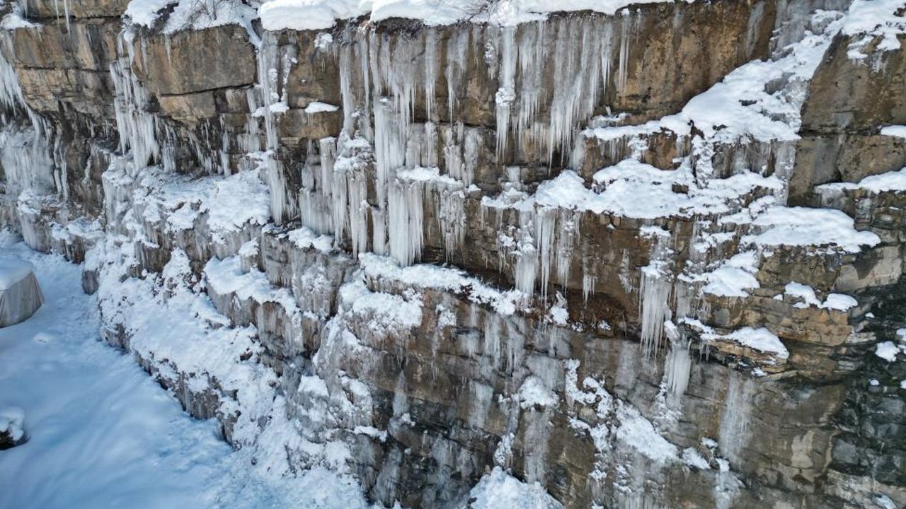 Şelale ve akarsuların tamamı donarken dağlar ve kayalarda ise dev buzdan sarkıtlar oluştu. Gece hava sıcaklığının eksi 20 dereceye kadar düştüğü bölgenin tamamı buz pistine döndü. Karlı ve buzlu bölgeler dronla kayıt altına alındı.