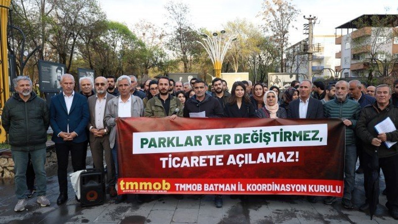 Türk Mühendis ve Mimar Odaları Birliği Batman İl Koordinasyon Kurulu, kayyım yönetimindeki Batman Belediyesi’nin yapımı devam eden Şehir Hastanesi ve Stadyum’un yanında bulunan alanda yapılan plan değişikliğine ilişkin Yılmaz Güney Parkı’nda açıklama gerçekleştirdi. “Parklar yer değiştirilemez, ticarete açılamaz” pankartının açıldığı açıklamaya siyasi parti ve sivil toplum örgütü temsilcileri katıldı.