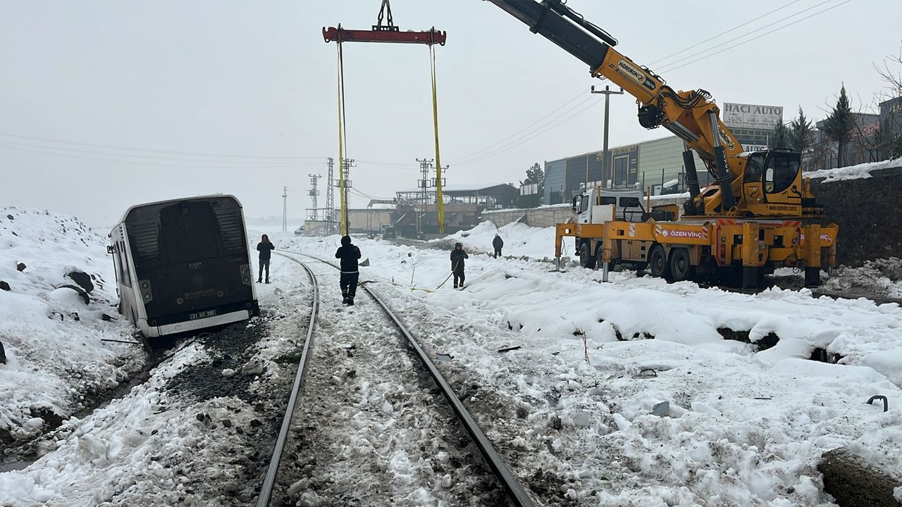 Diyarbakır merkez Yenişehir ilçesinde raylardan geçmeye çalışırken, Bismil ilçesi yönüne giden trenin çarptığı belediye otobüsü, vinçle kaza yerinden alındı.
