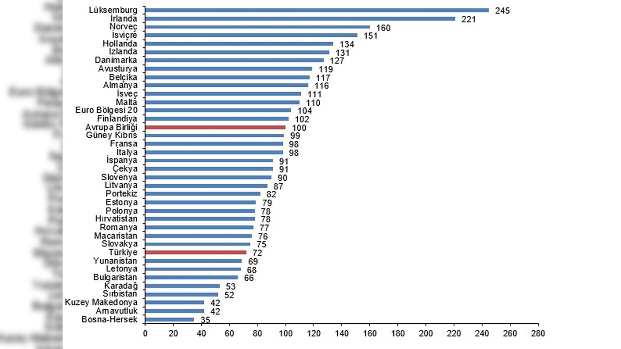 Avrupa Birliği İstatistik Ofisi (Eurostat) tarafından açıklanan satın alma gücü paritesine göre kişi başına gayrisafi yurt içi hasıla endeksi 2024 yılı sonuçlarına göre 27 Avrupa Birliği ülkesi ortalaması 100 iken, bu değer Türkiye için 72 oldu ve AB ortalamasının yüzde 28 altında kaldı.
