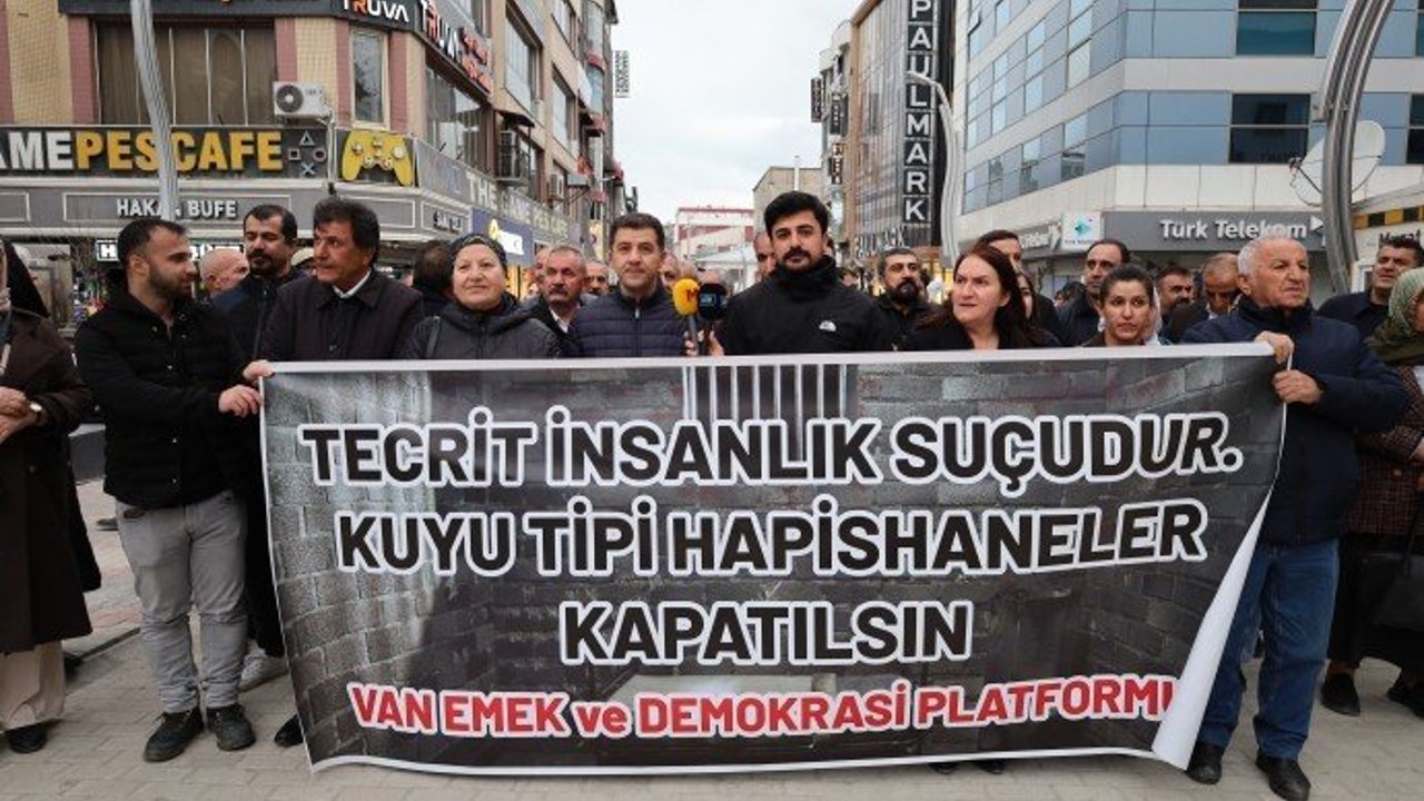 Van Emek ve Demokrasi Platformu, İşkence, kötü muamele ve hak ihlallerin yaşandığı "Kuyu Tipi" cezaevleri olarak bilinen Yeni Tip Yüksek Güvenlikli Kapalı Ceza İnfaz Kurumlarında devam ettirilen tecrit politikalarına ilişkin Sanat Sokağı’nda basın açıklaması gerçekleştirdi. Gerçekleştirilen basın açıklamasında, “Tecrit insanlık suçudur, Kuyu Tipi Hapishaneler kapatılsın”, pankartı açılırken, "Siyasi tutsaklar onurumuzdur" sloganları atıldı. Açıklamaya Halkların Eşitlik ve Demokrasi Partisi (DEM Parti) Van Milletvekili Mahmut Dindar, kente bulunan siyasi ve sivil toplum örgütü temsilcilerinin yanı sıra çok sayıda yurttaş katıldı.