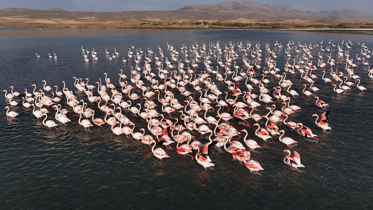 Pembe tüyleri, uzun zarif boyunları ve estetik duruşlarıyla doğa tutkunlarının gözdesi olan flamingolar, hava sıcaklığının mevsim normallerinin üzerinde seyrettiği bölgede konaklama sürelerini de uzattı. Başta İran'ın Urumiye Gölü olmak üzere birçok gölün kuruması sonrası Van Gölü kıyıları ve Erçek Gölü’nde konaklayan flamingolar görsel bir şölen sundu.