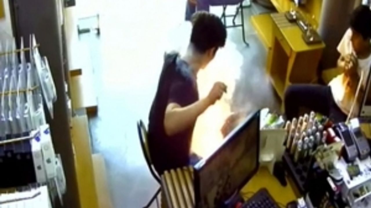 Bursa'da bir çocuk, elinde tuttuğu telefon bataryasının patlaması üzerine yanmaktan son anda kurtuldu. O anlar iş yerinin güvenlik kamerasına anbean yansıdı.