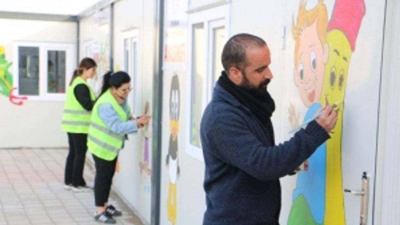 Diyarbakır'da Yenişehir Halk Eğitim Merkezi ve Yenişehir Belediyesi ekiplerince çadır kentte bulunan konteyner duvarlarına çocukların hayal dünyası grafiti ile yansıtıldı.